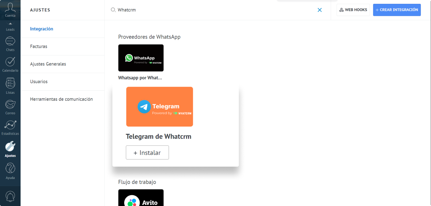 Ve al marketplace de Kommo.com e ingresa "Telegram Whatcrm" en el campo de búsqueda.