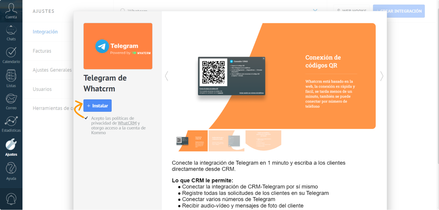 ¡Listo! Ahora tu Telegram está conectado a Kommo.com a través de la aplicación Whatcrm.