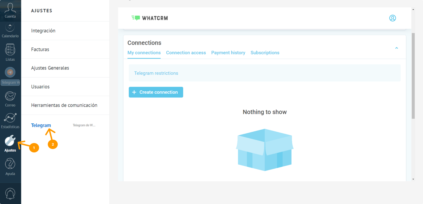 Opción 2: Abre la configuración de Kommo.com y selecciona "Telegram" en el menú inferior.