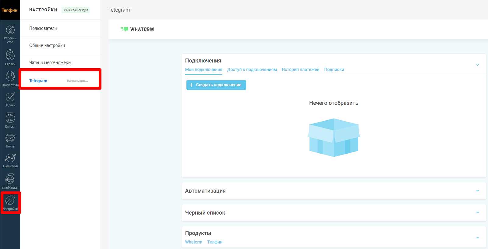 4. Откройте настройки amoCRM и нажмите на Telegram\ <br>