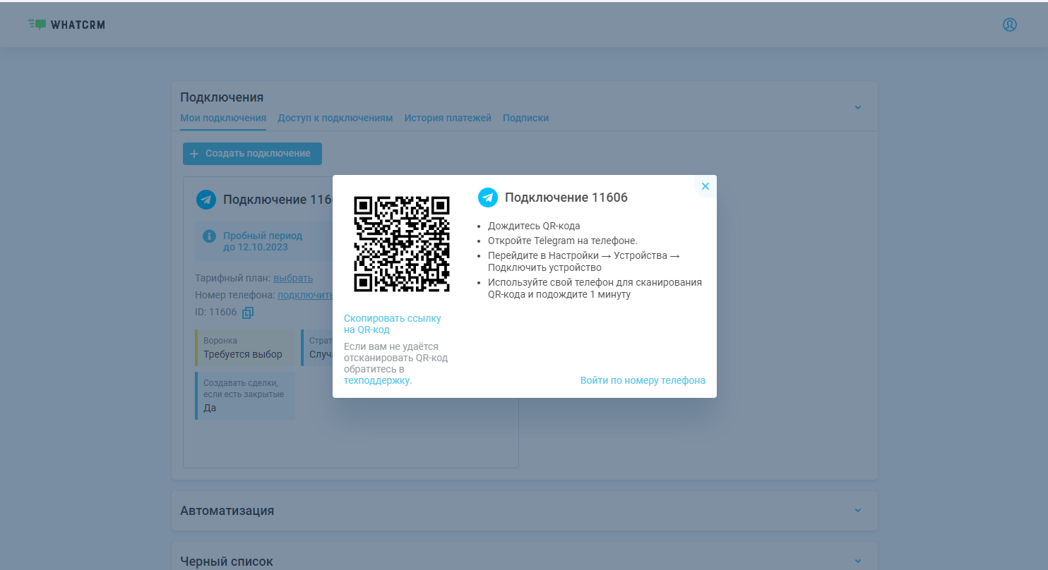 6. Откройте мобильное приложение Telegram и `отсканируйте QR-код из пирложения. Вы можете авторизоваться по номеру телефона, в правом нижнем углу нажмите на '`**`Войти по номеру телефона`**`'`<br>