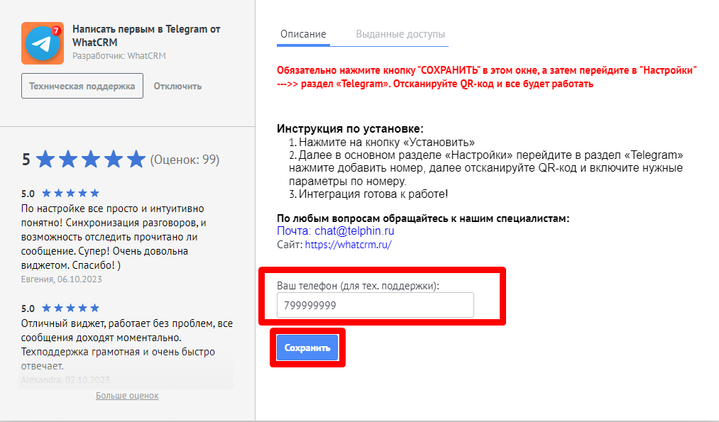 3. В окне установленного приложения введите ваш номер телефона и нажмите `'Сохранить'`<br>
