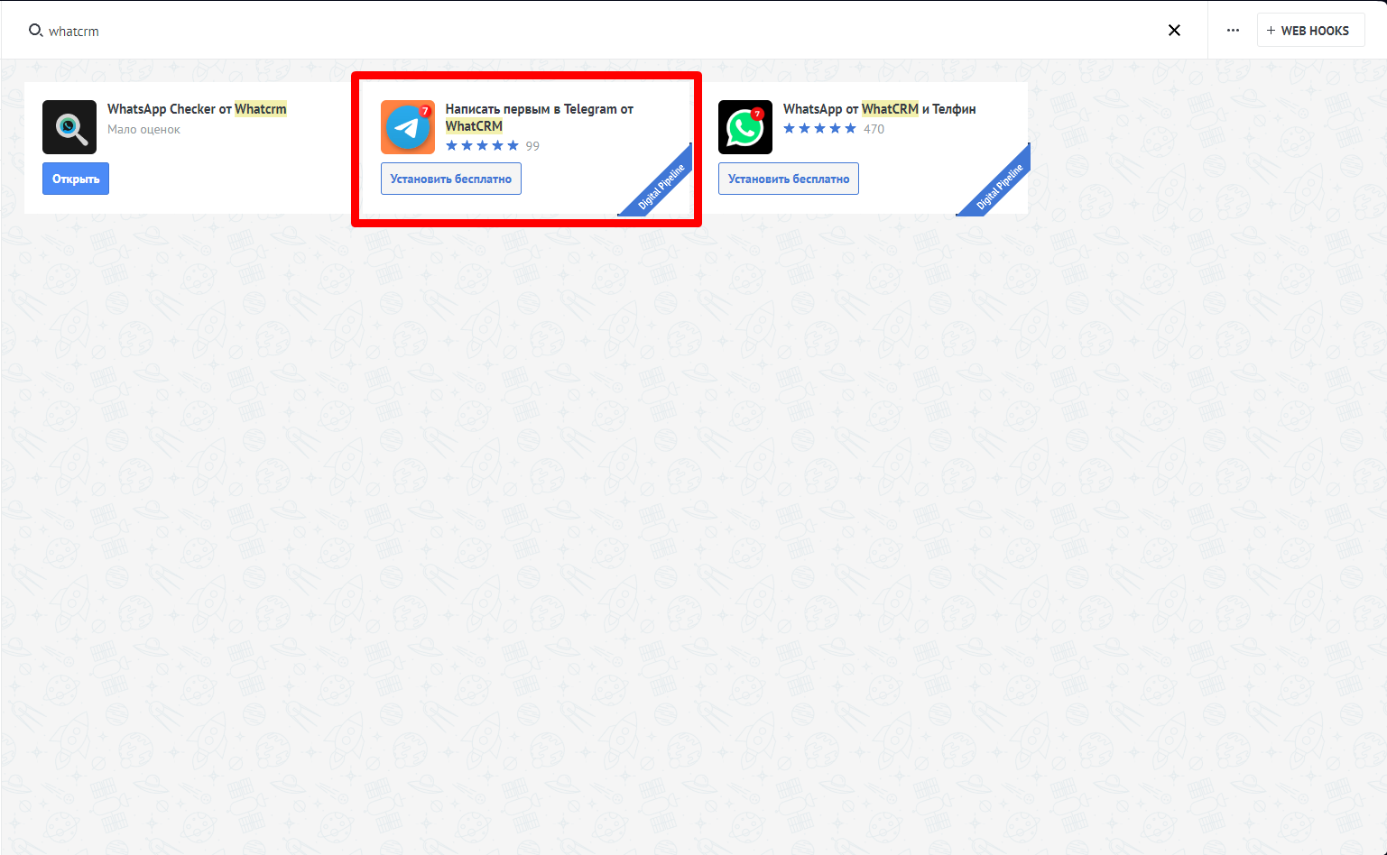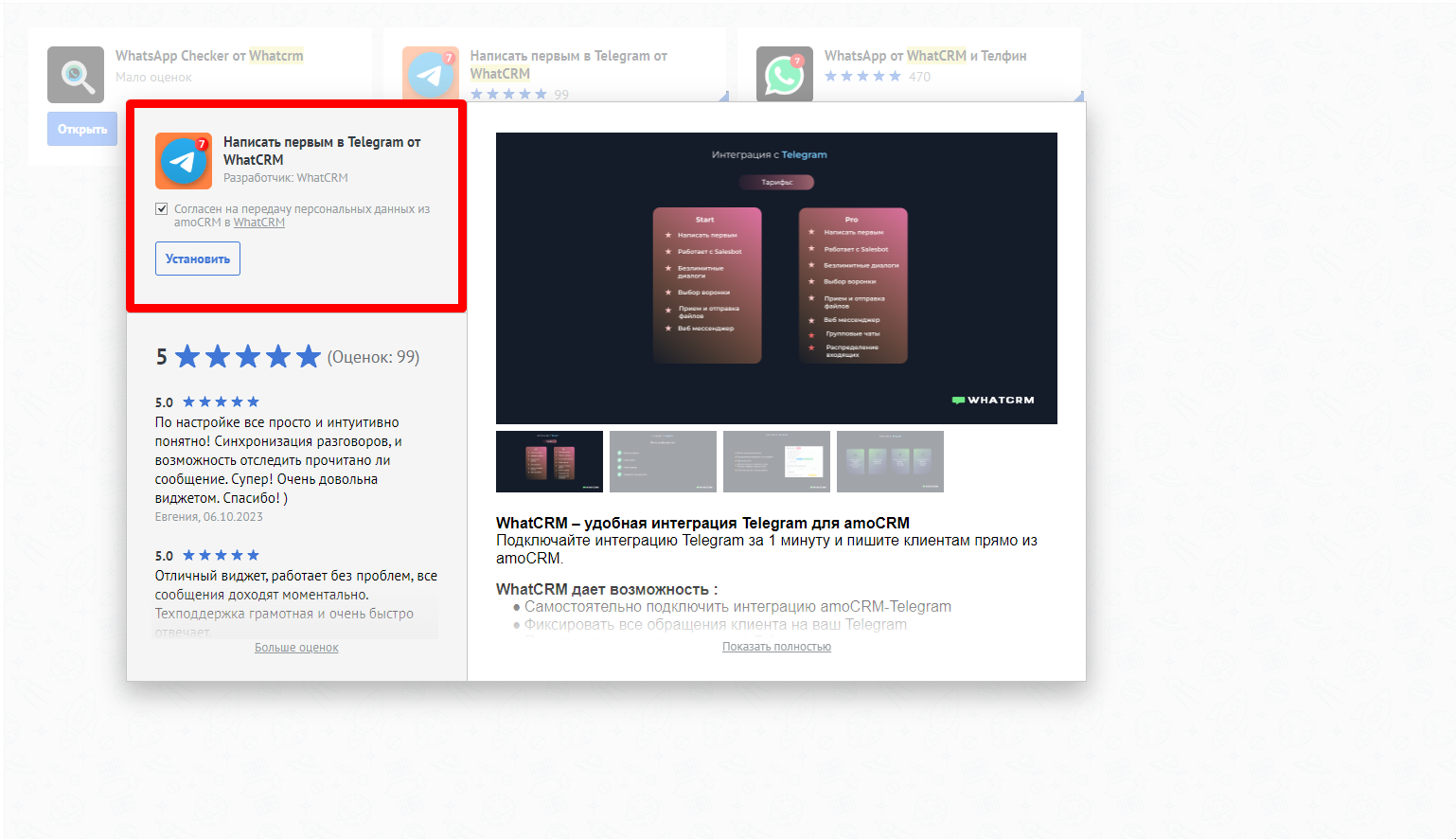 1. Откройте маркетплейс amoCRM и в поле поиска введите название приложения "Whatcrm". Выберите  Telegram из списка и нажмите  `Установить бесплатно`.\