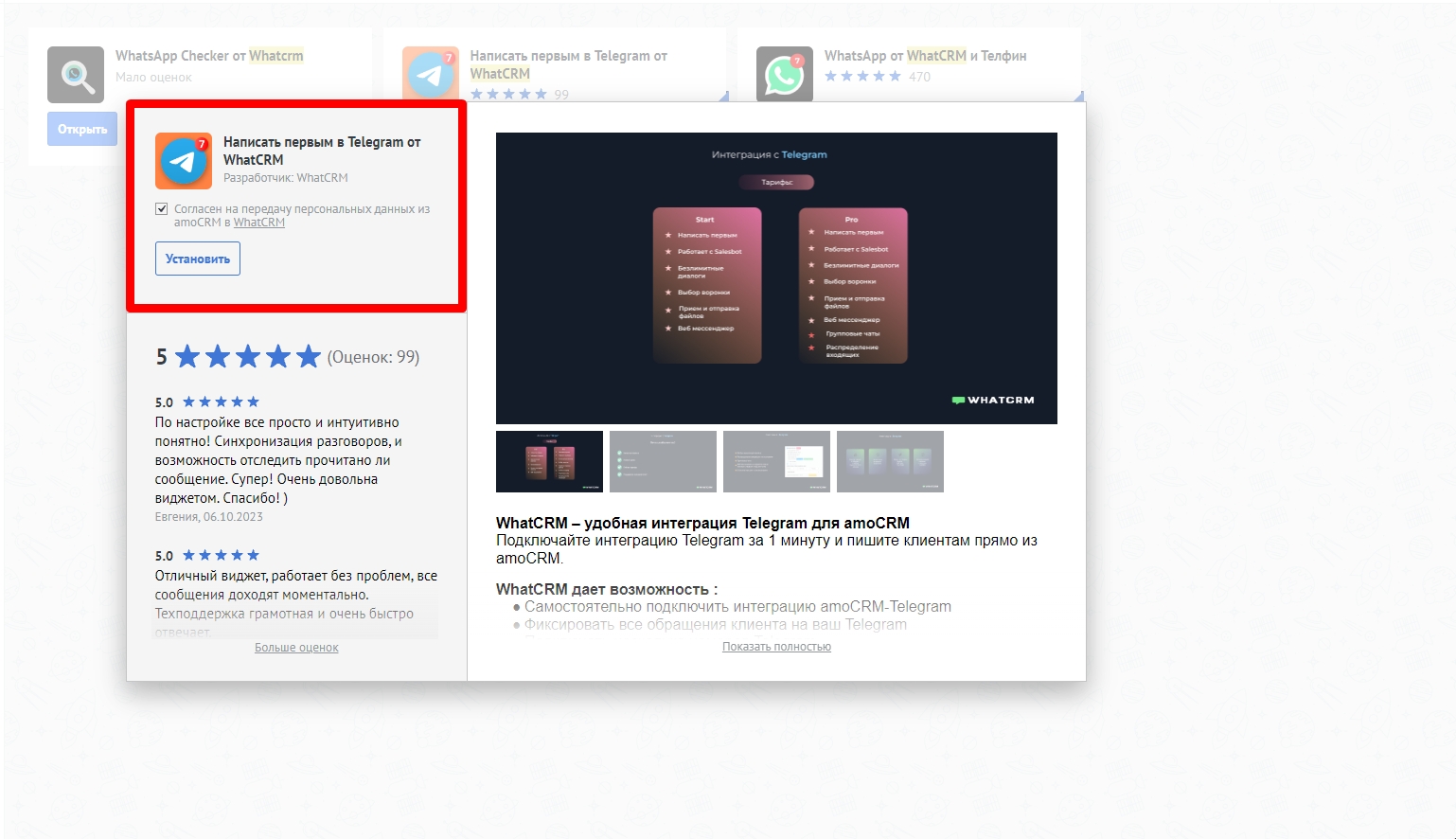 - Откройте маркетплейс amoCRM и в поле поиска введите название приложения "Whatcrm". Выберите Telegram из списка и нажмите - Установить бесплатно. Установить интеграцию можно перейдя по этой ссылке