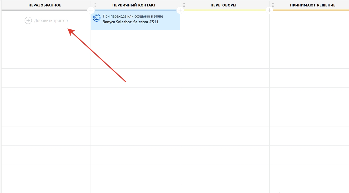 На нужном этапе в ячейке нажать на кнопку “Добавить триггер” и выбрать Salesbot.