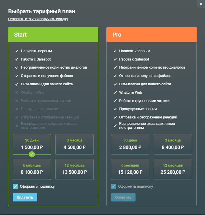 Выберите подходящий тарифный план и количество месяцев на этапе оплаты, затем нажмите кнопку "Оплатить".