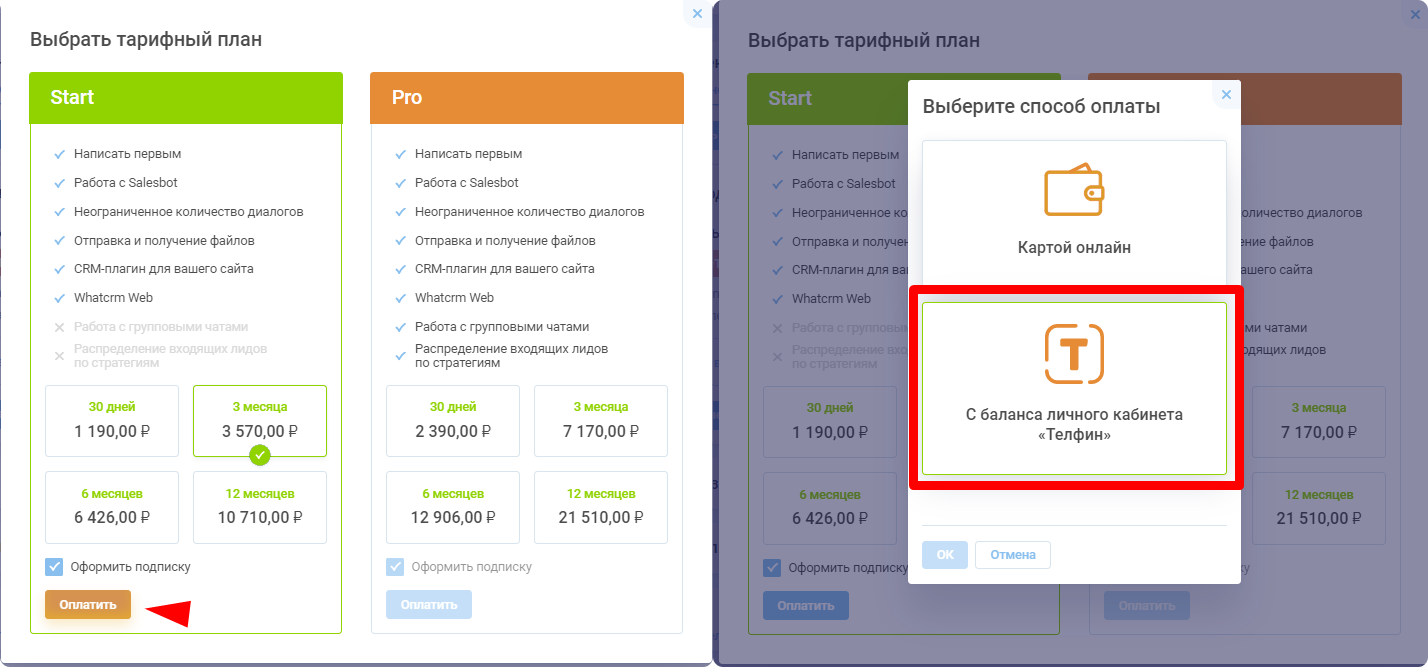 4. Вернитесь в виджет и перейдите в раздел "Подключения". Здесь выберите тариф для номера и нажмите кнопку "Выбрать". Укажите нужное количество месяцев подписки и нажмите "Оплатить". На странице оплаты выберите опцию "Оплатить с баланса личного кабинета Телфин".